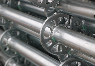 一层水平杆:将水平杆头套入圆盘小孔位置使水平杆头前端抵住立杆圆管,再以插销贯穿小孔敲紧固定的。